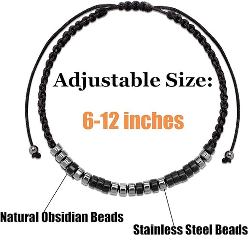 Adjustable size bracelet with natural obsidian & stainless steel beads